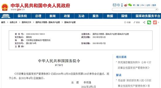 2020年12月30日,《行政事业性国有资产管理条例》于国务院第120次常务会议通过,2021年3月17日中国政府网予以公布,自2021年4月1日起该条例施行。
